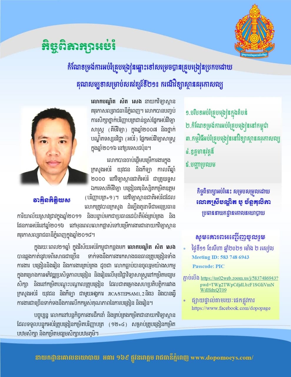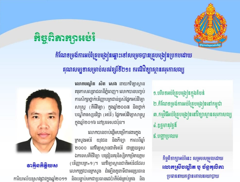 កិច្ចពិភាក្សាអប់រំស្ដីពីកំណែទម្រង់ការអប់រំគ្រូបង្រៀនឆ្ពោះទៅសម្រេចបានគ្រូបង្រៀនប្រកបដោយគុណសម្បទាសម្រាប់សតវត្សរ៍ទី២១៖ករណីវិទ្យាស្ថានគរុកោសល្យនេះ រៀបចំឡើងដោយមានការអញ្ជើញចូលរួមពីវាគ្មិនកិត្តិយស លោកបណ្ឌិត សិត សេង នាយកវិទ្យាស្ថានគរុកោសល្យរាជធានីភ្នំពេញ និងសម្របសម្រួលដោយលោកស្រីបណ្ឌិត បូ ច័ន្ទគុលិកា ប្រធាននាយកដ្ឋានគោលនយោបាយ។ សូមគោរពអញ្ជើញឯកឧត្តម លោកជំទាវ លោក លោកស្រី អ្នកនាងកញ្ញាដែលមានចំណាប់អារម្មណ៍លើកិច្ចពិភាក្សានេះចូលរួមតាមរយៈតំណភ្ជាប់ខាងក្រោម៖
