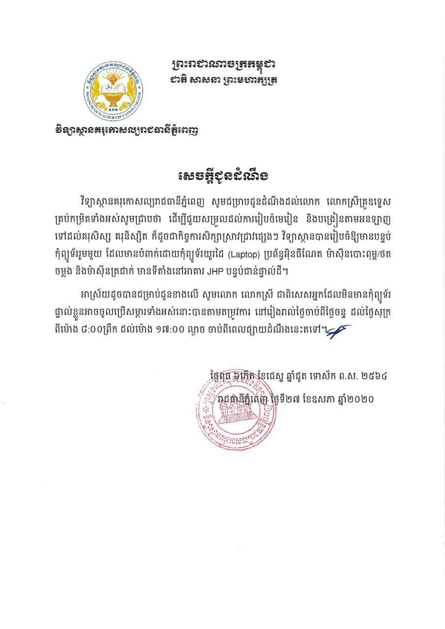 វិទ្យាស្ថានគរុកោសល្យរាជធានីភ្នំពេញ សូមជម្រាបជូនដំណឹងដល់លោក លោកស្រីគ្រូឧទ្ទេស គ្រប់កម្រិតទាំងអស់សូមជ្រាបថា ដើម្បីជួយសម្រួលដល់ការរៀបចំមេរៀន និងបង្រៀនតាមអនឡាញ ទៅដល់គរុសិស្ស គរុនិស្សិត ក៏ដូចជាកិច្ចការសិក្សាស្រាវជ្រាវផ្សេងៗ វិទ្យាស្ថានបានរៀបចំឱ្យមានបន្ទប់កុំព្យូទ័ររួមមួយ ដែលមានបំពាក់ដោយកុំព្យូទ័រយួរដៃ (Laptop) ប្រព័ន្ធអ៊ិនធឺណែត ម៉ាស៊ីនបោះពុម្ព/ថត ចម្លង និងម៉ាស៊ីនត្រជាក់ មានទីតាំងនៅអាគារ JHP បន្ទប់ជាន់ផ្ទាល់ដី។